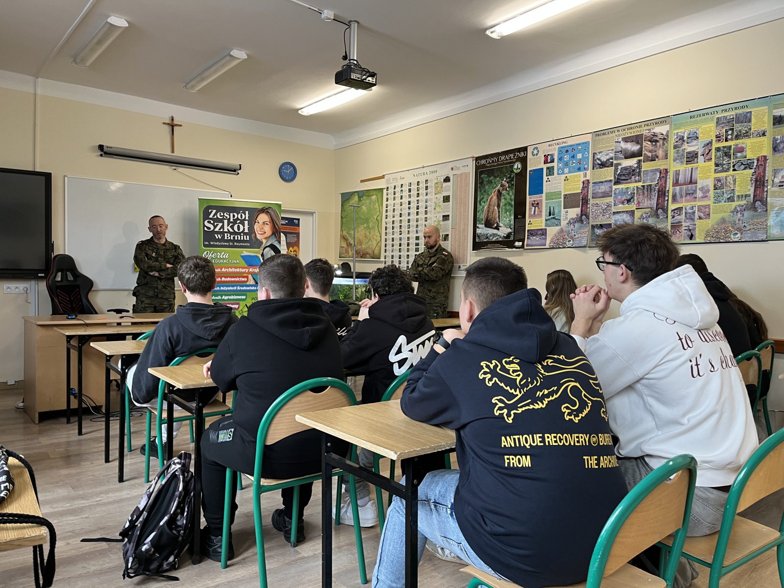 W poniedziałek naszej szkole odbyło się spotkanie z żołnierzami Wojska Polskiego, które było skierowane do uczniów klas 3 branżowej szkoły oraz 5 technikum. Podczas spotkania żołnierze opowiadali o swojej codziennej pracy oraz o tym, na czym polega służba wojskowa. Przedstawili różne rodzaje jednostek wojskowych oraz możliwe ścieżki kariery w wojsku. Omówione zostały także wymagania, jakie trzeba spełnić, aby wstąpić do wojska, m.in. dotyczące zdrowia, sprawności fizycznej oraz wykształcenia. Żołnierze zwrócili uwagę na zalety pracy w wojsku, takie jak stabilne zatrudnienie, możliwość zdobycia nowych umiejętności, awansu oraz udziału w specjalistycznych szkoleniach. Podczas spotkania uczniowie mogli zadawać pytania i dowiedzieć się więcej o rekrutacji oraz warunkach służby.