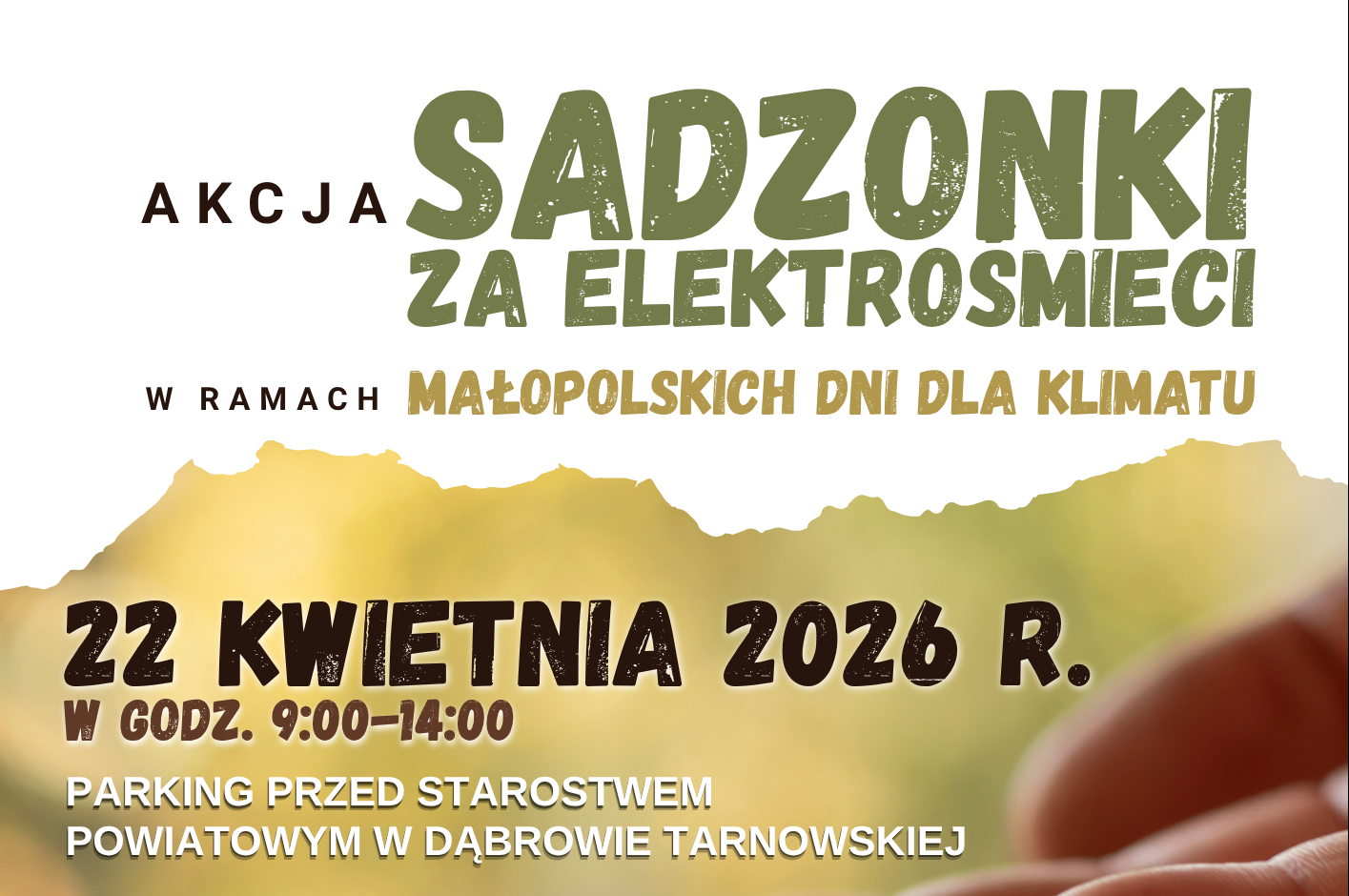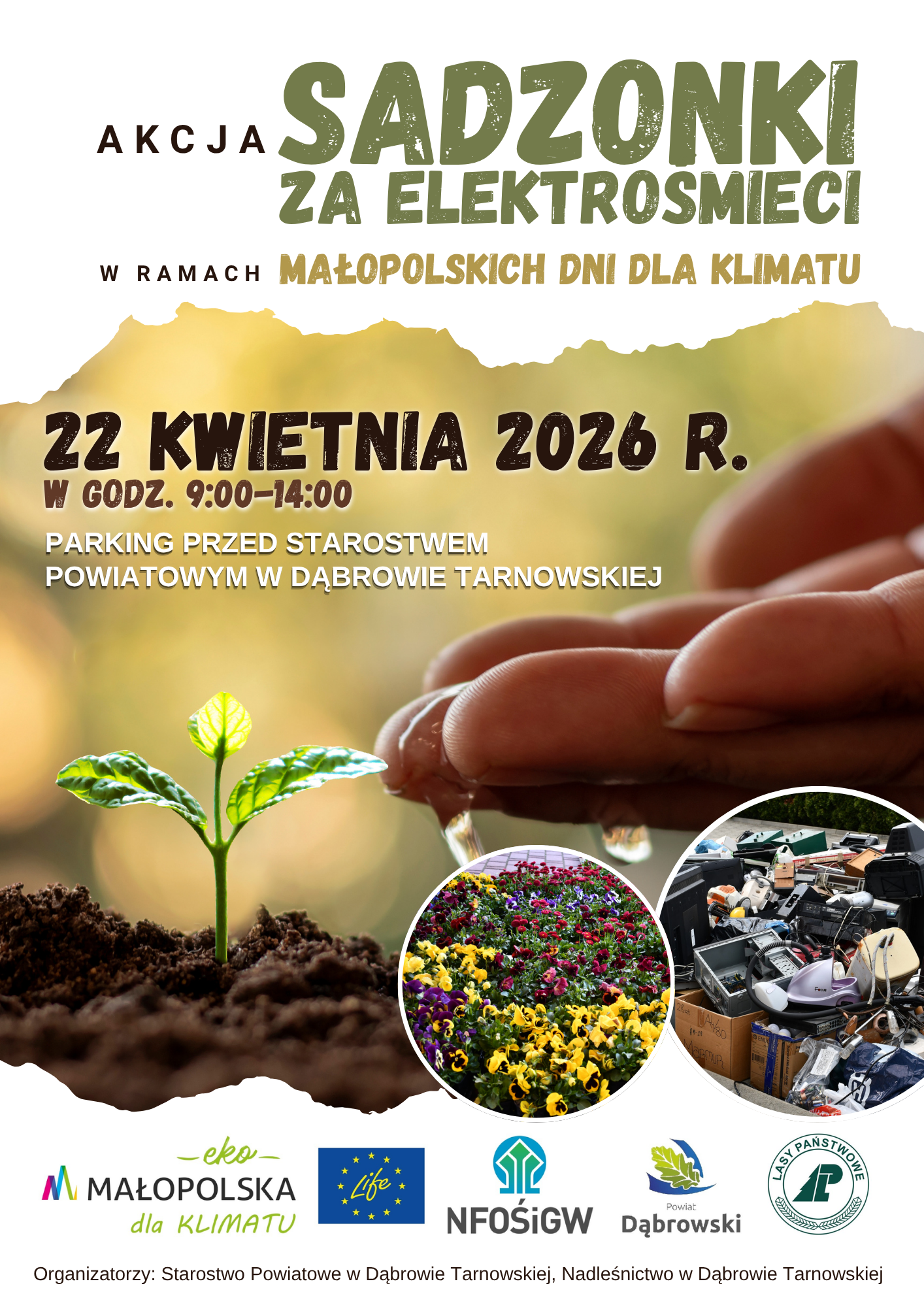 Wicemarszałek Województwa Małopolskiego Ryszard Pagacz oraz Starosta Dąbrowski Lesław Wieczorek zapraszają do udziału w akcji „Sadzonki za elektroodpady”, organizowanej w ramach 5. Małopolskiego Dnia dla Klimatu. Wydarzenie odbędzie się w środę, 22 kwietnia 2026 r., w godz. 9:00–14:00 na parkingu przed Starostwem Powiatowym w Dąbrowie Tarnowskiej.